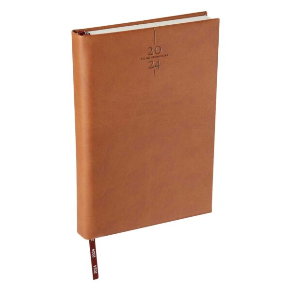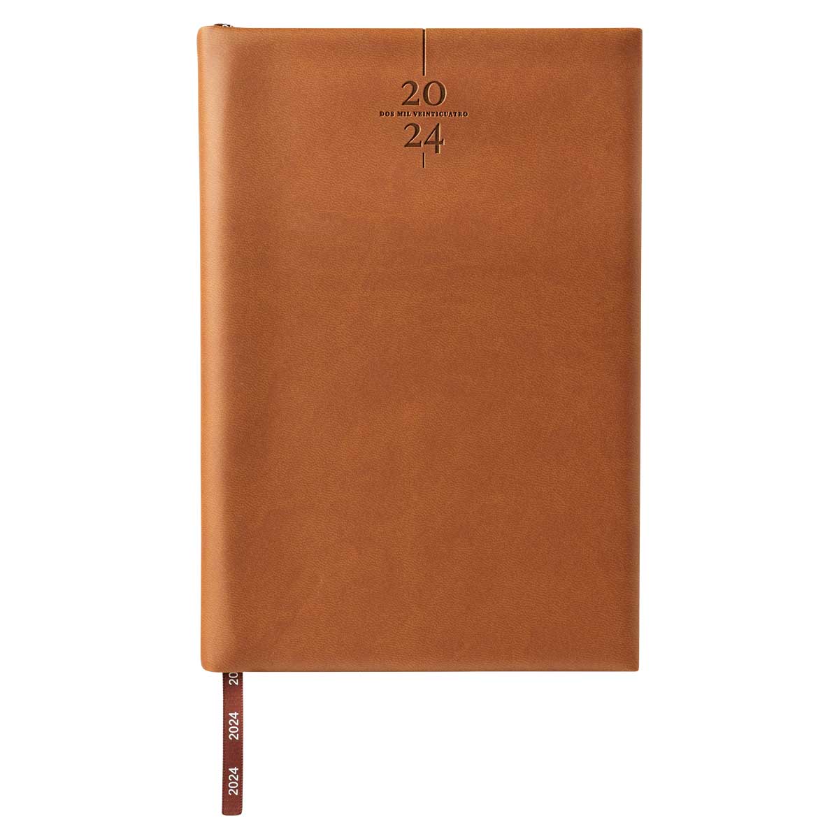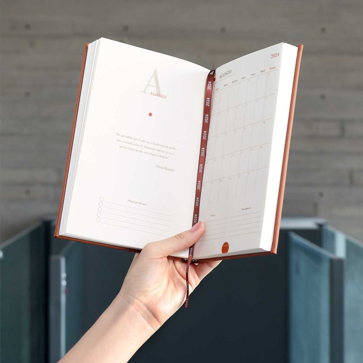 Agenda diaria con 186 hojas. Contiene datos personales, calendarios 2023-2024-2025, planeador 2024, presupuesto de gastos, seguimiento de nuevos hábitos, organizador de tareas, planeador de proyecto y días festivos. Incluye caja individual.