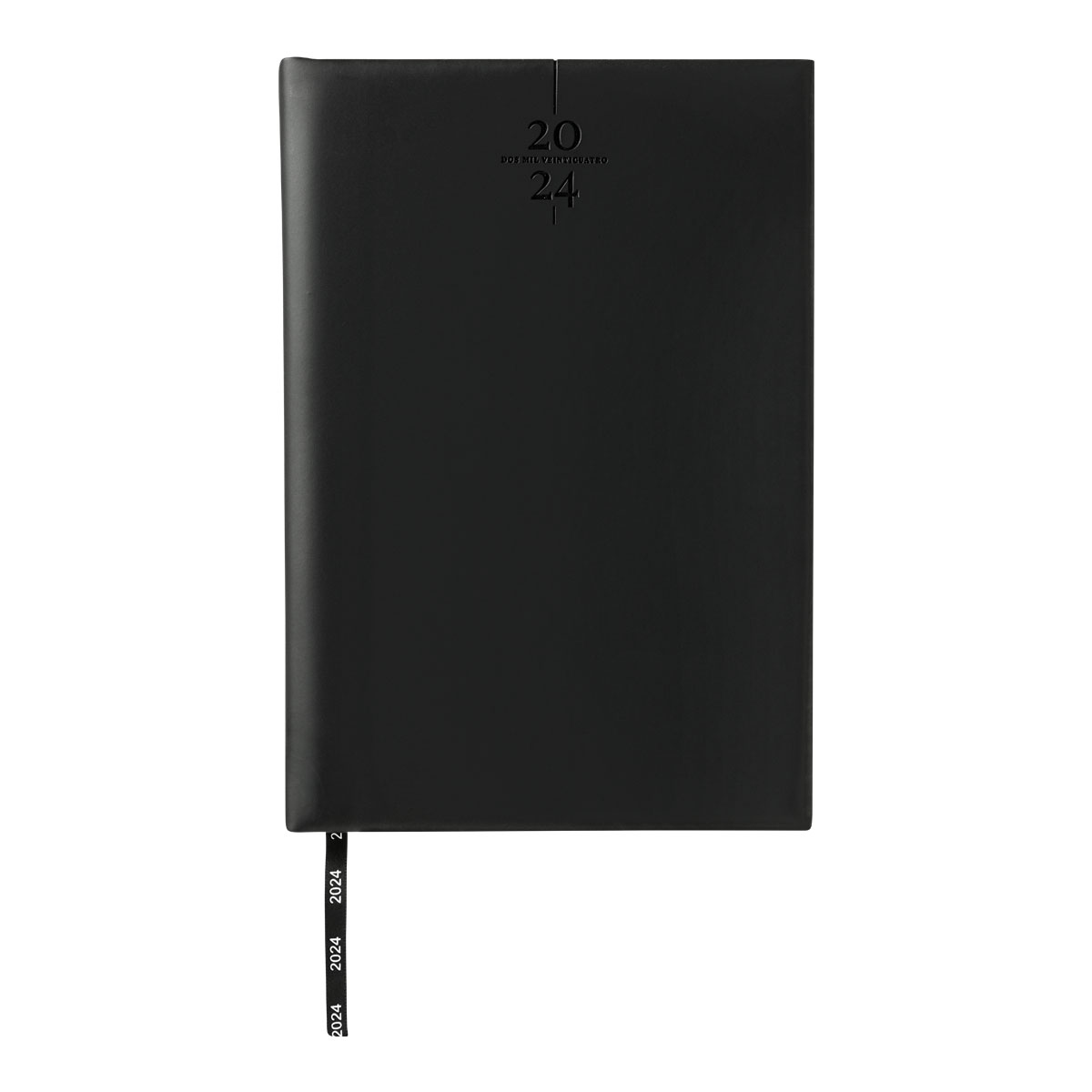 Agenda diaria con 186 hojas. Contiene datos personales, calendarios 2023-2024-2025, planeador 2024, presupuesto de gastos, seguimiento de nuevos hábitos, organizador de tareas, planeador de proyecto y días festivos. Incluye caja individual.