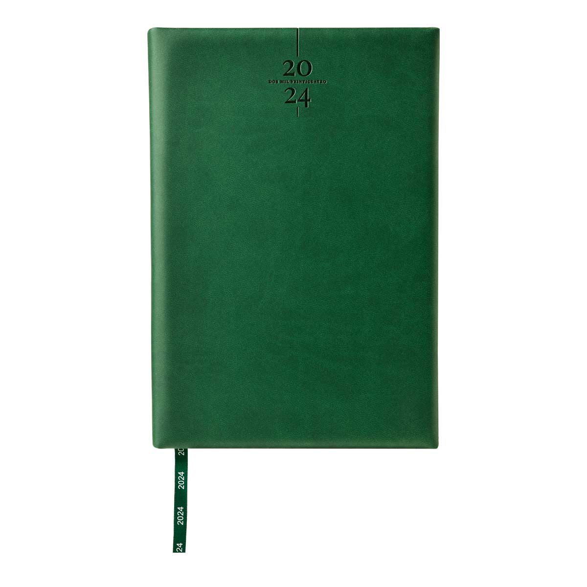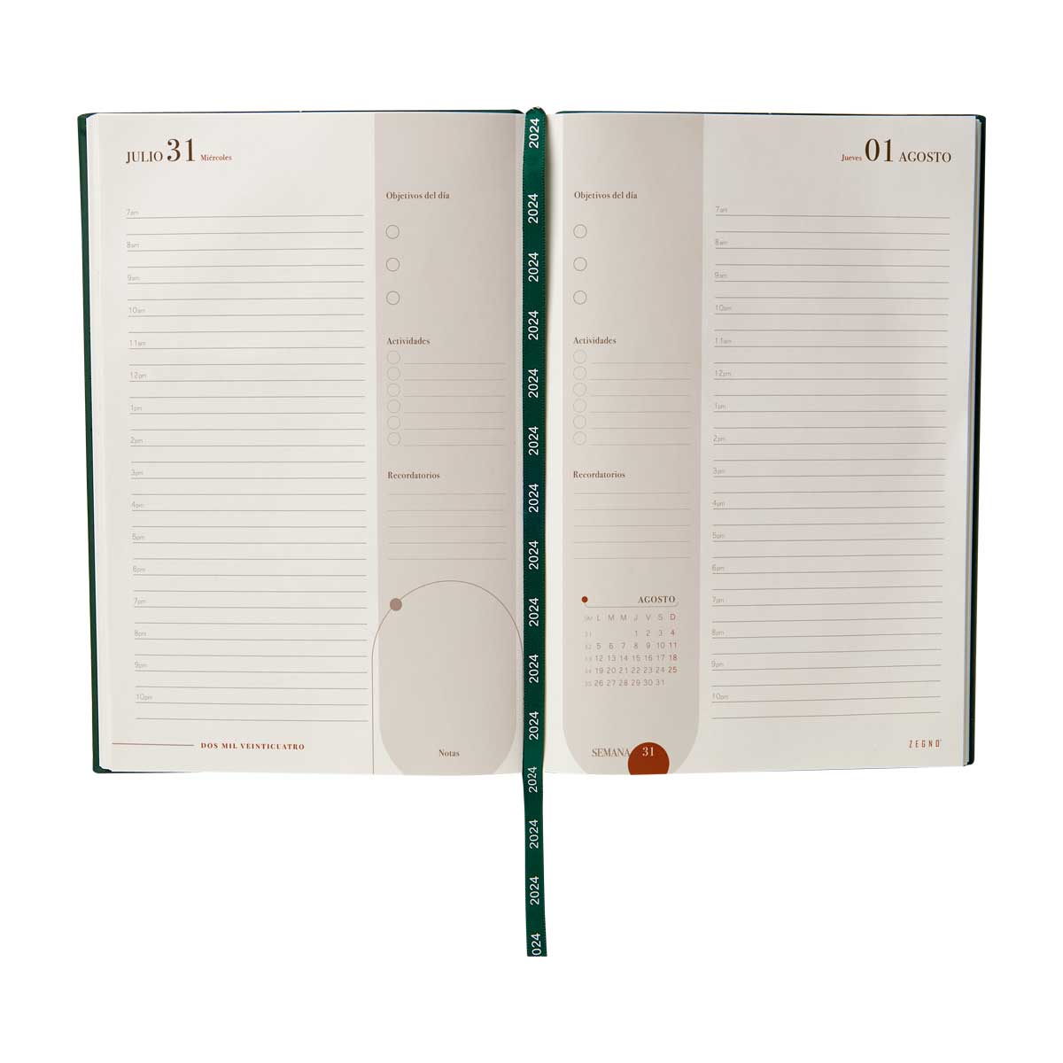 Agenda diaria con 186 hojas. Contiene datos personales, calendarios 2023-2024-2025, planeador 2024, presupuesto de gastos, seguimiento de nuevos hábitos, organizador de tareas, planeador de proyecto y días festivos. Incluye caja individual.