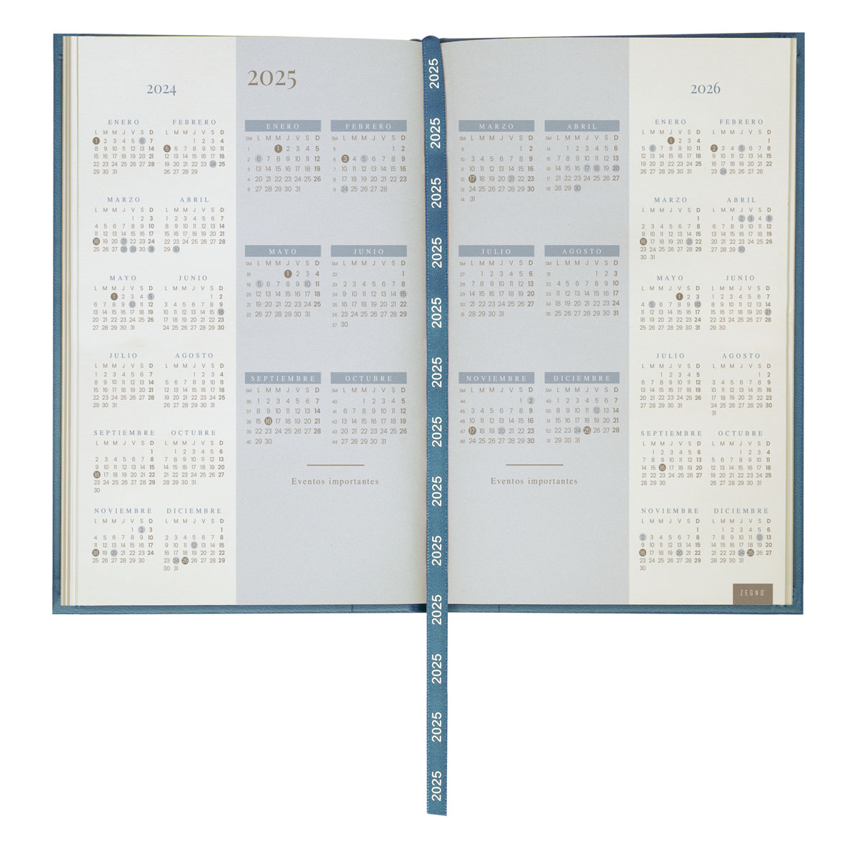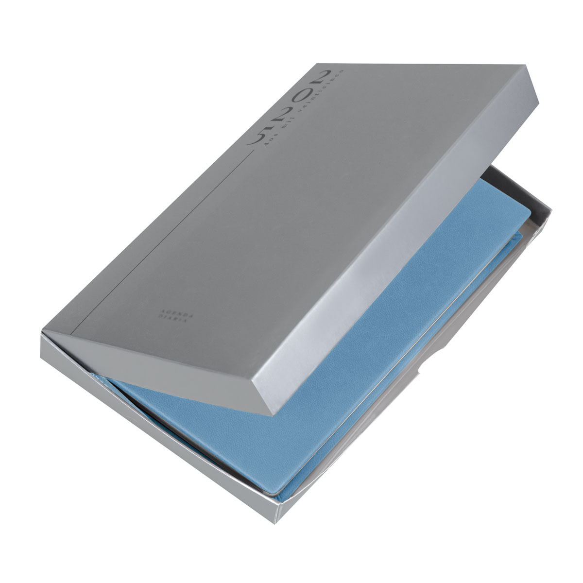 Agenda diaria con 186 hojas. Contiene datos personales, calendarios 2024-2025-2026, planeador 2025, presupuesto de gastos, seguimiento de nuevos hábitos, organizador de tareas, planeador de proyecto y días festivos. Incluye caja individual.