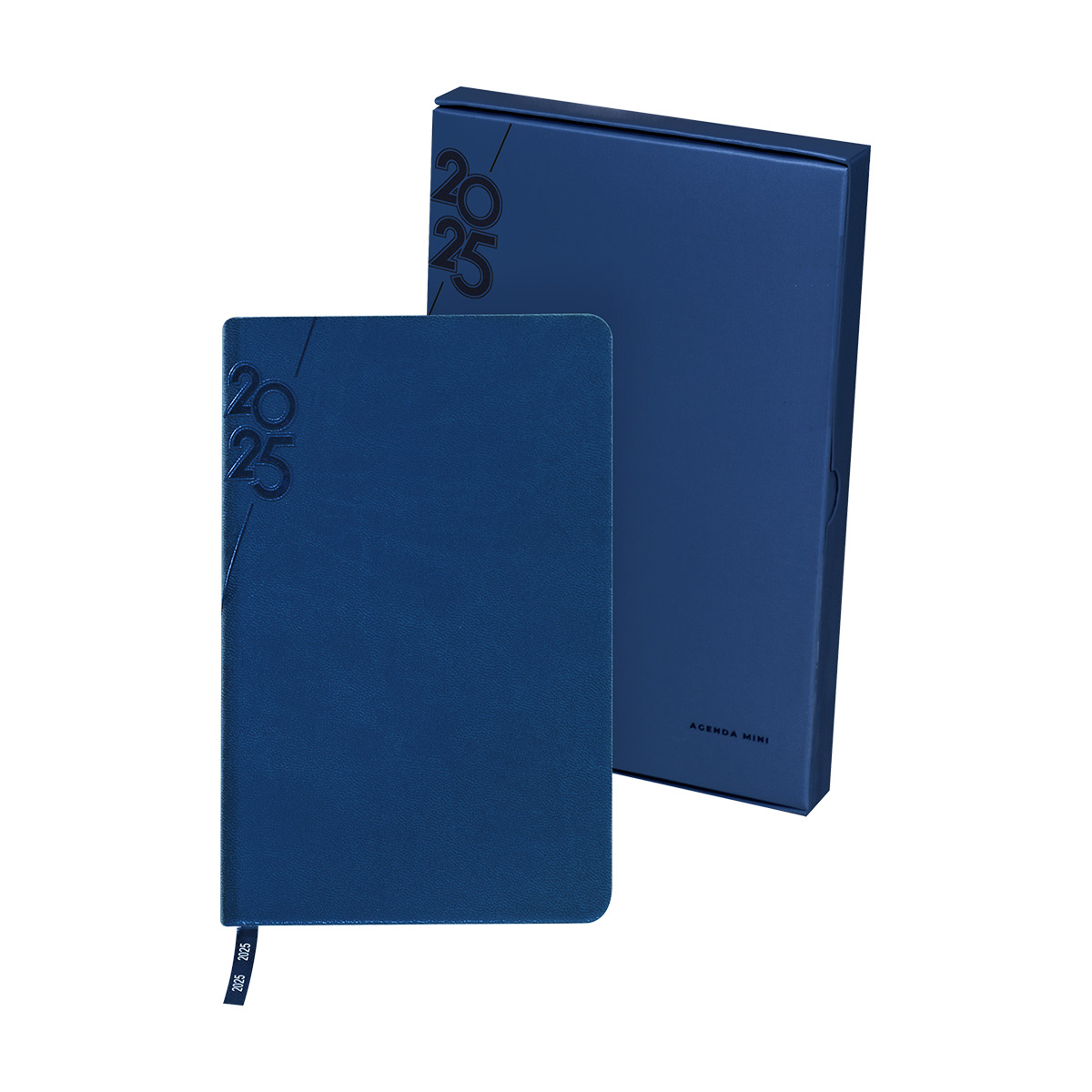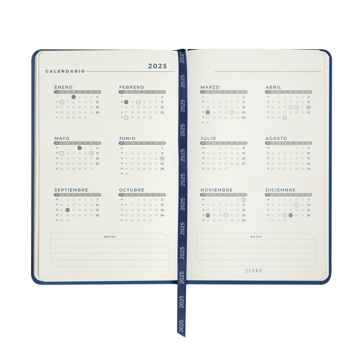 Agenda semanal con 80 hojas. Contiene datos personales, calendarios 2024-2025-2026, planeador 2025, seguimiento de nuevos hábitos, organizador de tareas, planeador de proyecto y días festivos. Incluye caja individual del mismo color a la agenda.