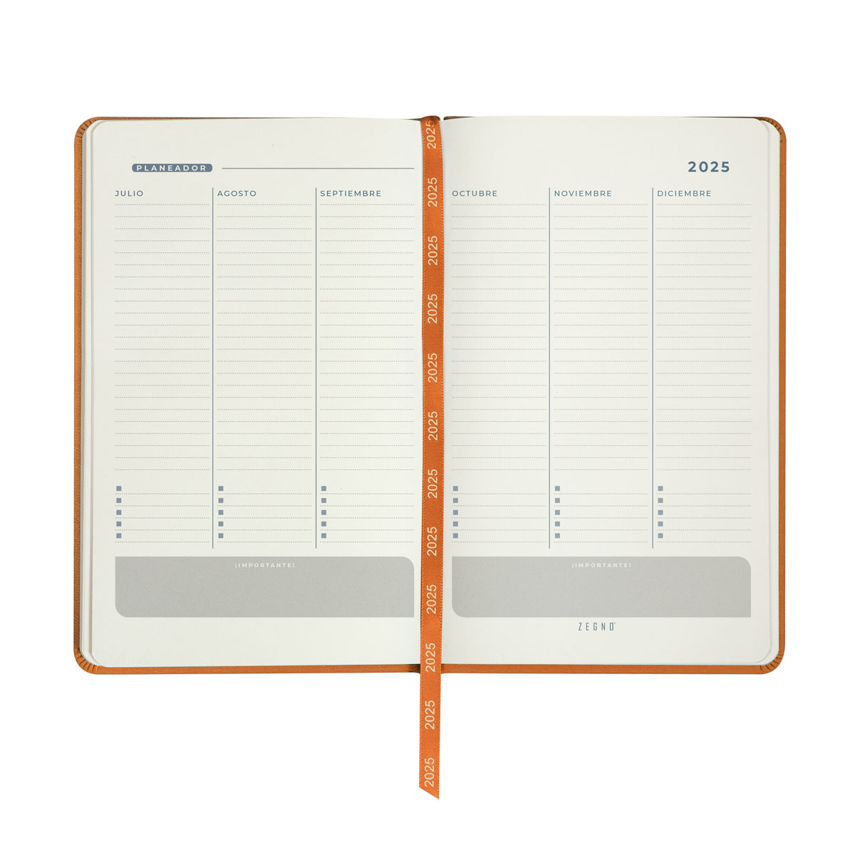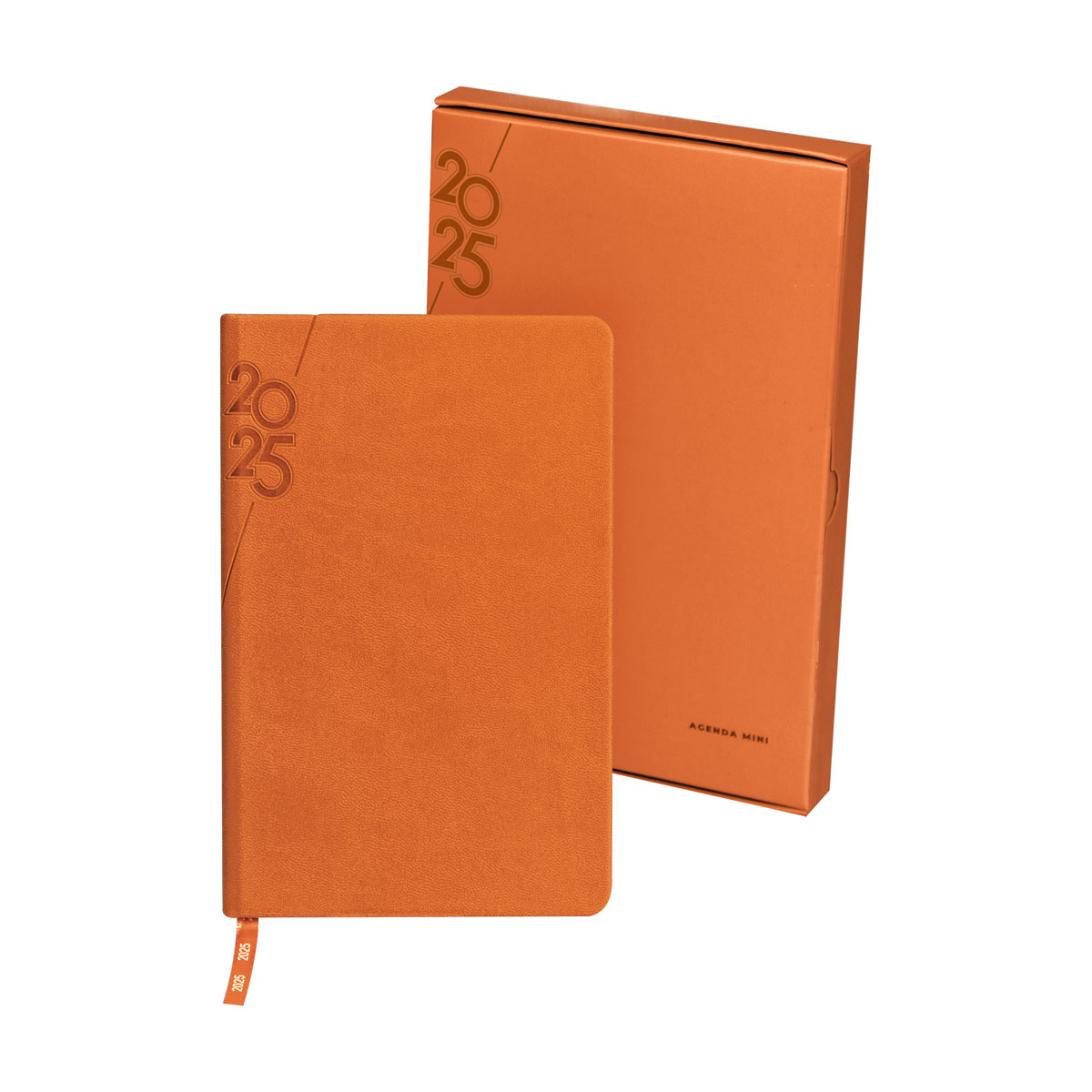 Agenda semanal con 80 hojas. Contiene datos personales, calendarios 2024-2025-2026, planeador 2025, seguimiento de nuevos hábitos, organizador de tareas, planeador de proyecto y días festivos. Incluye caja individual del mismo color a la agenda.