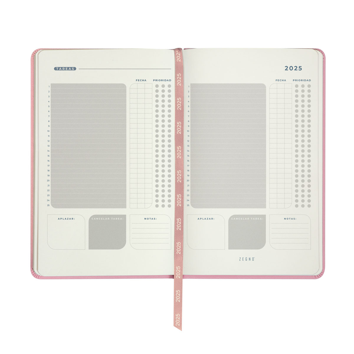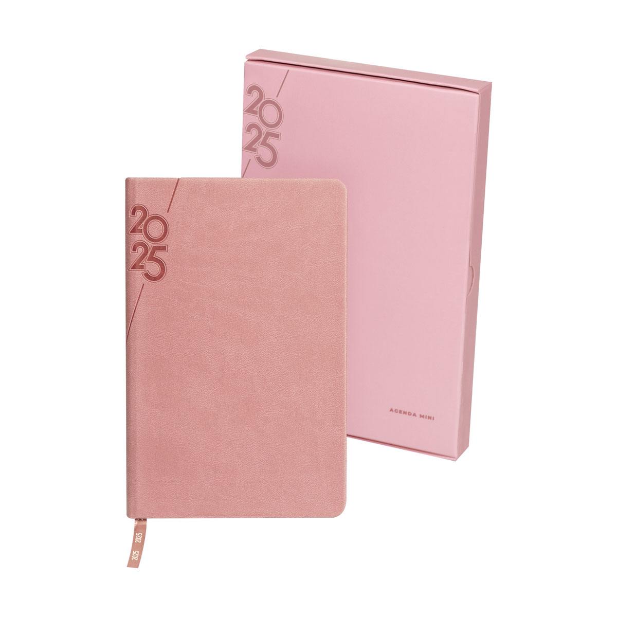 Agenda semanal con 80 hojas. Contiene datos personales, calendarios 2024-2025-2026, planeador 2025, seguimiento de nuevos hábitos, organizador de tareas, planeador de proyecto y días festivos. Incluye caja individual del mismo color a la agenda.