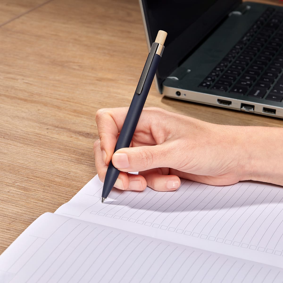 Bolígrafo con terminado tipo rubber. Mecanismo pulsador y botón de madera.