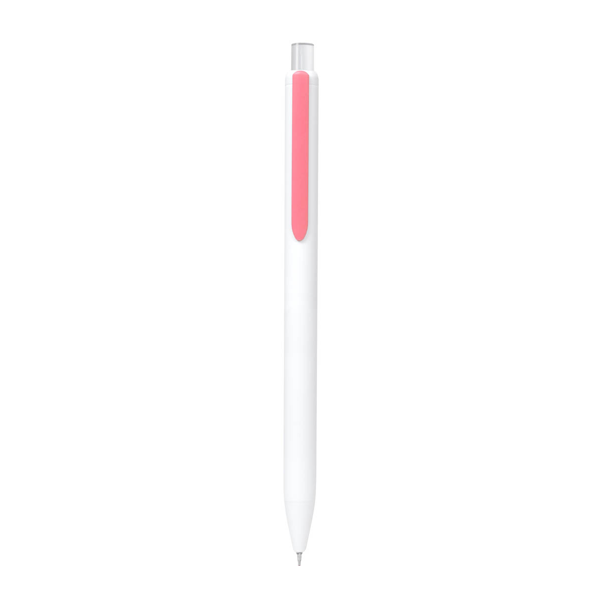 Bolígrafo con tinta semigel. Clip simulado que añade un toque de color moderno. Mecanismo pulsador.