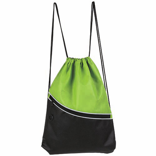 Bolsa-mochila con tirantes de cordón y cerrado de jareta. Incluye bolsa frontal con cierre y aditamento especial para audífonos.