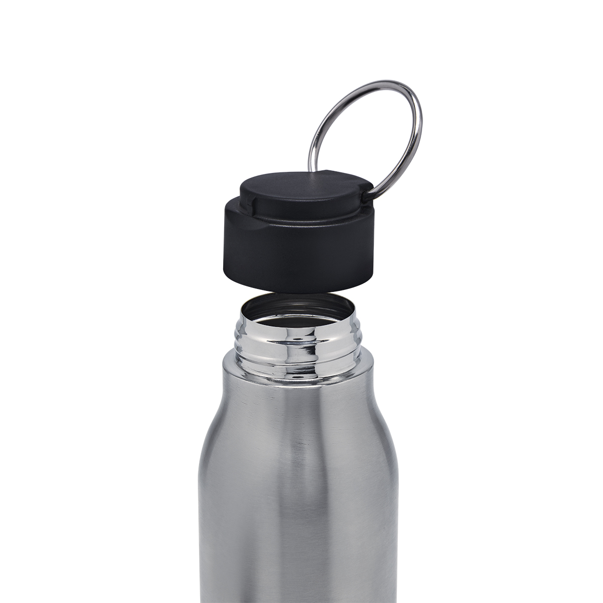 Cilindro metalico de una pared y tapa de plastico con cierre de rosca. Incluye aro metalico en la tapa que funciona como asa. Terminado mate. Incluye caja individual.