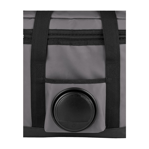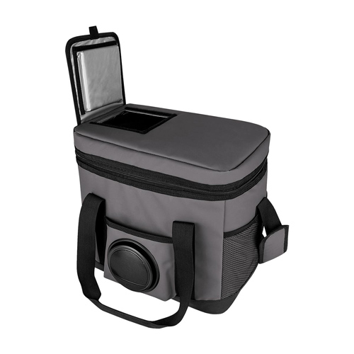 Hielera con bocina bluetooth desprendible con batería recargable de 2 horas de reproducción de música aproximadamente. Interior plastificado impermeable. Cubierta con ventana para fácil acceso al interior. Incluye bolsa frontal para bocina, 2 bolsas laterales de red, asas y correa ajustable. Capacidad para 24 latas.