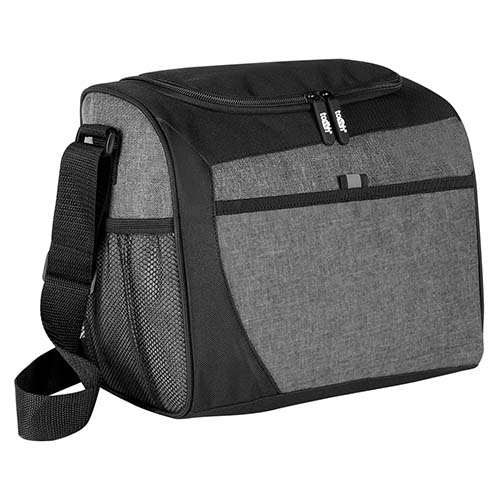Interior metalizado. Bolsa principal y frontal con cierre. Bolsa lateral de malla y correa ajustable. Capacidad para 16 latas.