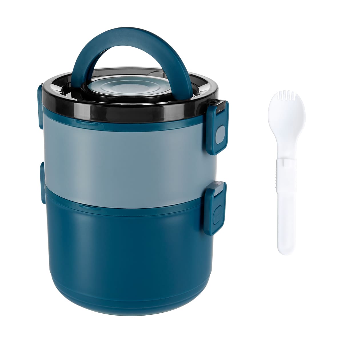 Contenedor de alimentos con dos pisos independientes que permite separar tus alimentos y no mezclar sabores. Fabricado con una pared sencilla de plástico, ideal para el uso de microondas. Cada compartimento cuenta con su tapa hermética para evitar derrames y sus broches laterales ayudan unir o separar cada elemento. Incluye cuchara de plástico, tapa con asa plegable y caja individual. Apto para el uso en microondas y lavavajillas.