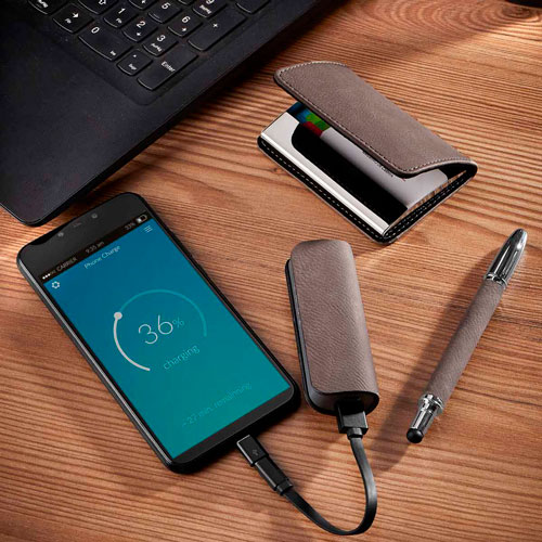 Incluye batería auxiliar para smartphone, capacidad 2,600 mAh, bolígrafo con touch screen, tarjetero terminado curpiel y caja de regalo.