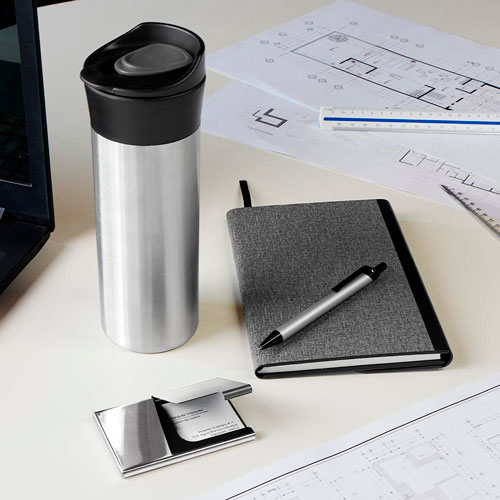Incluye termo de doble pared con válvula de seguridad, tarjetero con acabado cromado (posición vertical), bolígrafo de aluminio y caja de regalo.